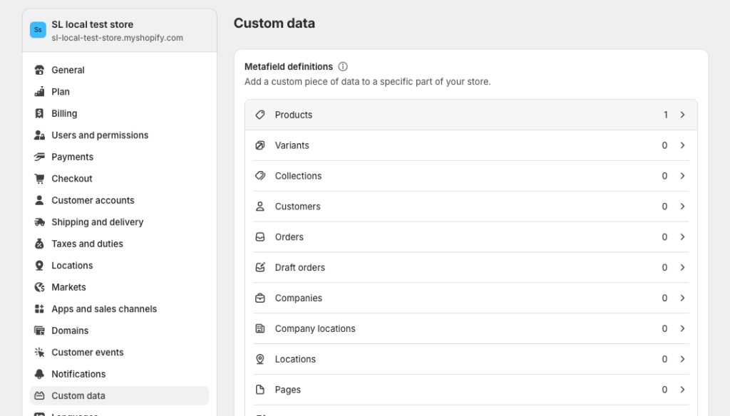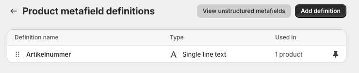 To use the created meta fields in your Shopify store, you must first add them as a definition. To do this, click on the “View unstructured meta fields” button: