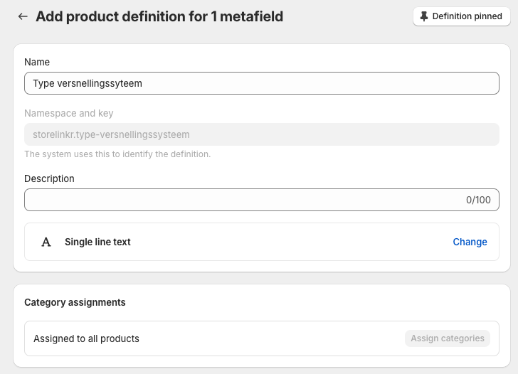 A list of unlinked meta fields will now be displayed. Select the fields you want to use in your online store and click on “Add definition” behind the definition: